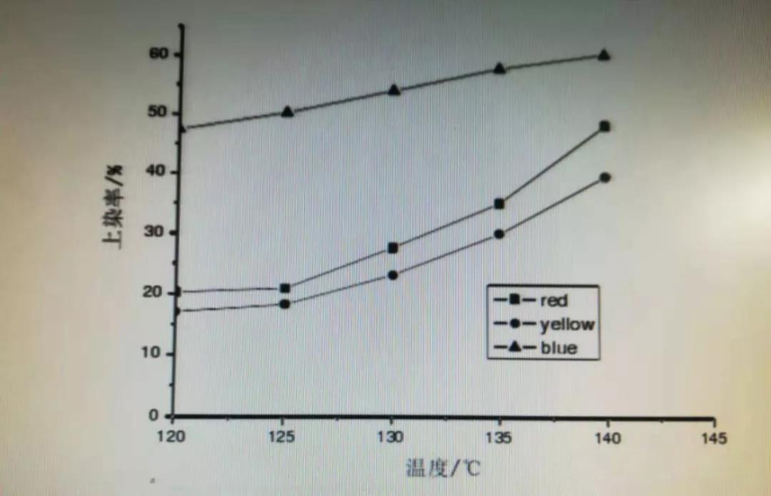 采用分散艷紅SF-B、分散黃S-4G和分散深藍UN-SE(2%(o.w.f.))三只分散染料,在pH值4.5、浴比1:30,分別于120、125、130、135和140℃對芳綸織物染色保溫60min,染色溫度與分散染料在芳綸織物的上染率關系見圖2.2: