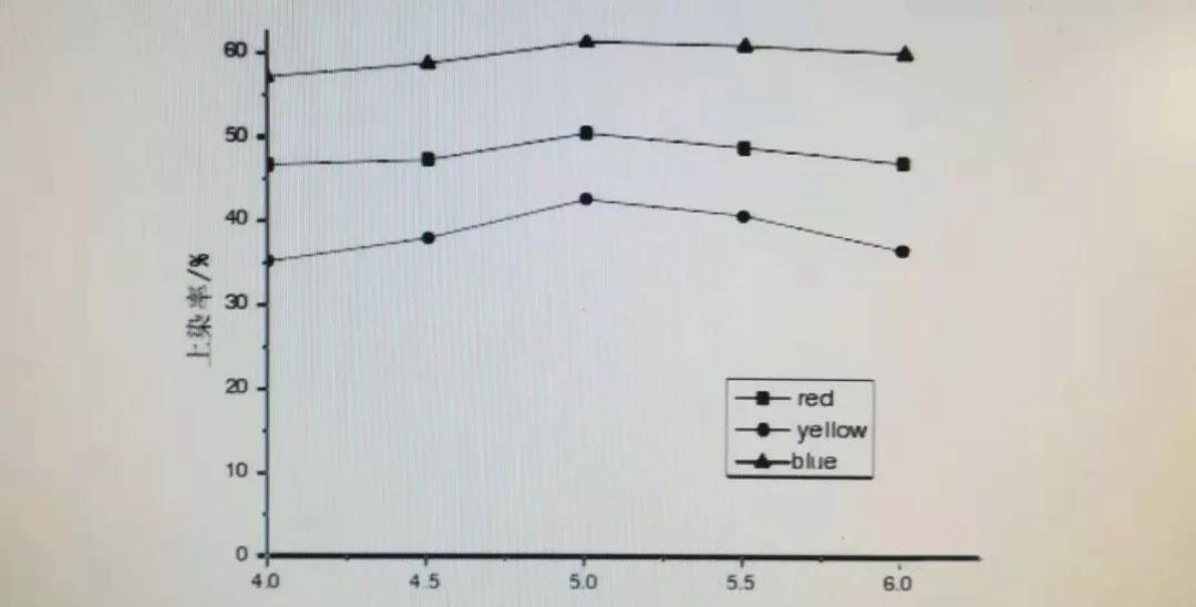 在染色溫度140℃、保溫時間60min和浴比1:30時,改變染液pH值為4.0、4.5、5.0、5.5和6.0進行試驗,染液pH值與分散染料在芳綸織物的上染率關系見圖2.4:上染率達到最大;但繼續增大pH值,其上染率有所下降,這可能是因為分散染料適合于在弱酸性條件下染色,故染色pH值定在5.0。